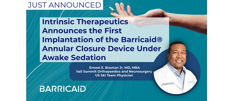BOSTON, Sept. 2, 2025 /PRNewswire/ — Intrinsic Therapeutics, Inc., a medical technology company committed to redefining the standard of care for lumbar discectomy patients with large annular defects by reducing reoperations for reherniations by 81%* with its Barricaid Annular Closure Device, announced today that, for the first time, the Barricaid device has been successfully implanted in several patients while they were awake and without the use of general anesthesia. The procedures were performed by Ernest E. Braxton Jr., MD, MBA, a Board-Certified neurosurgeon that specializes in minimally invasive and awake spine surgery in Vail, Colorado.