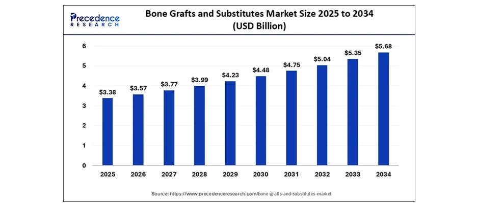 According to Precedence Research, the global bone grafts and substitutes market size will grow from USD 3.38 billion in 2025 to nearly USD 5.68 billion by 2034, with an expected CAGR of 5.94% from 2025 to 2034. Growth is driven by rising orthopedic disorders, trauma cases, and demand for advanced bone healing solutions, with innovations in biomaterials, 3D printing, and bioresorbable grafts creating opportunities across orthopedic, dental, and spinal applications.