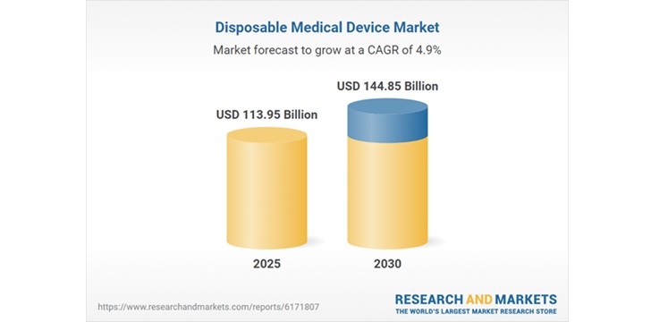 The global disposable medical device market is projected to reach USD 144.85 billion in 2030, growing from USD 113.95 billion in 2025, at a CAGR of 4.9%