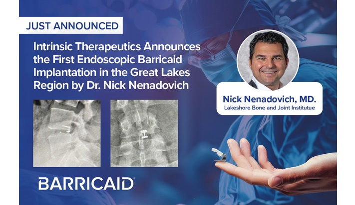 BOSTON, Nov. 14, 2025 /PRNewswire/ — Intrinsic Therapeutics, Inc., the makers of the Barricaid® Bone-Anchored Annular Closure Device, announced today the first endoscopic Barricaid implantation in the Great Lakes Region was completed by Nick Nenadovich, MD, a University of Chicago trained, board-certified orthopedic surgeon.